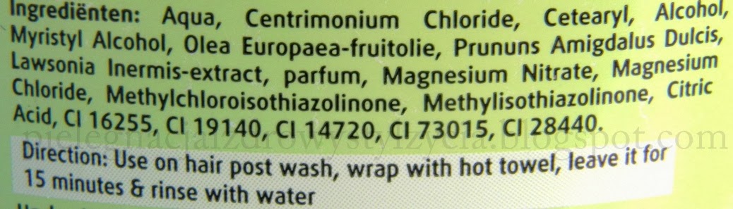Maska bardzo ładnie nawilża włosy, wygładza, odżywia, ułatwia ich rozczesywanie. W żadnym wypadku ich nie obciąża i nie wzmaga przetłuszczania. Jednak, żeby efekty były tak fajne, trzeba ją trzymać na włosach długo, najlepiej pod czepkiem. Trzymana krótko nie daje jakiś szczególnych efektów.